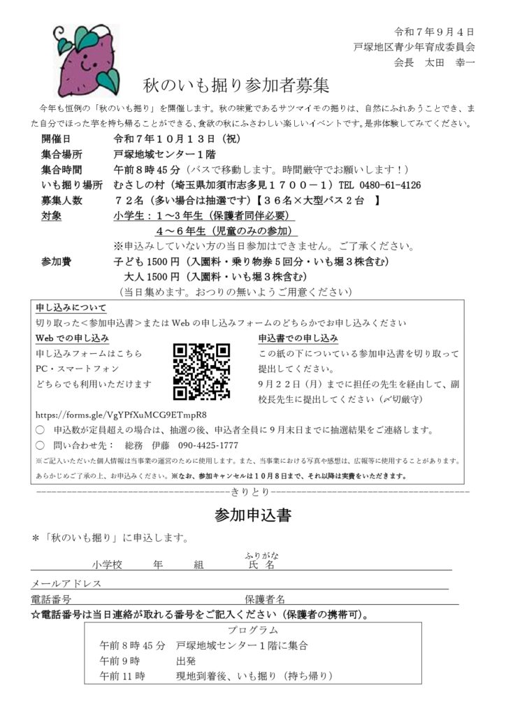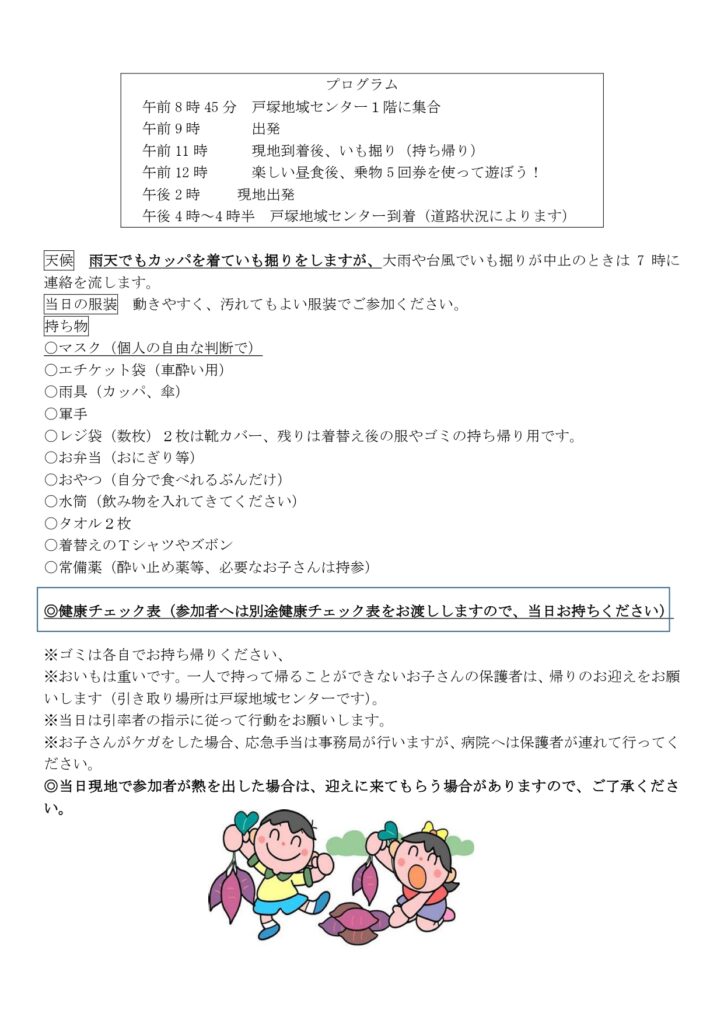 今年も恒例の「秋のいも掘り」を開催します。秋の味覚であるサツマイモの掘りは、自然にふれあうことでき、また自分でほった芋を持ち帰ることができる、食欲の秋にふさわしい楽しいイベントです。詳細は以下をご覧の上、グーグルフォームよりお申し込みください。