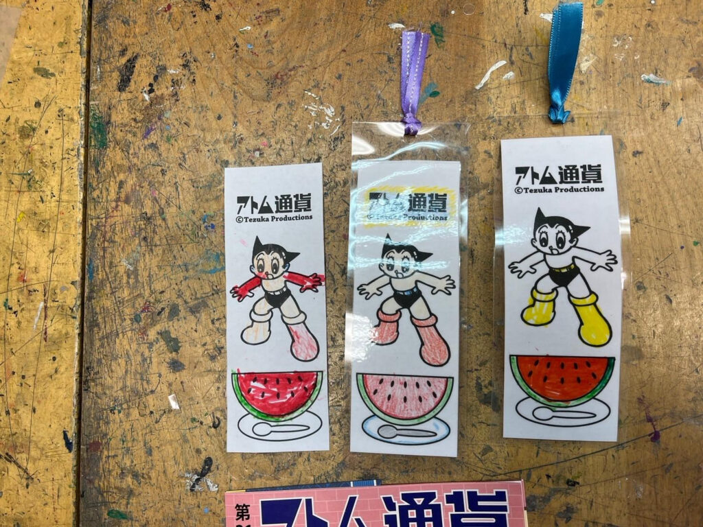 会場となった戸塚第一小学校では、PTA、早大生、おやじの会などに混ざって育成会も高田馬場生まれの鉄腕アトム柄の栞づくりのブースを出展しました。ブースには300人を超える来場があり、子どもたちは「自分だけの栞」を作って持ち帰りました。