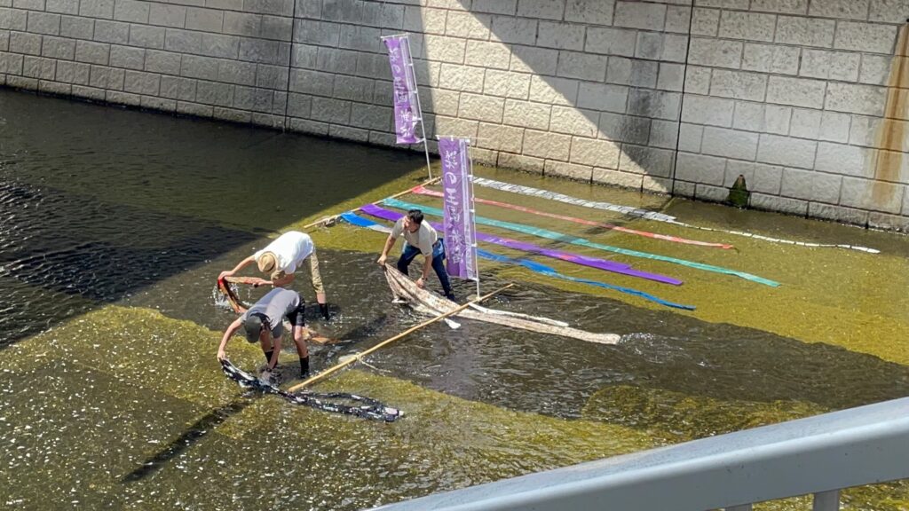 水元とは、着物の染色時に付いた糊や色を洗い流す工程のことです。当日はその工程を説明・再現します。どなたでもご覧になれます。