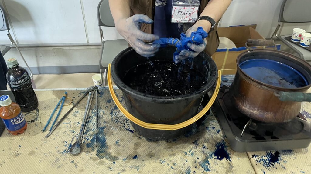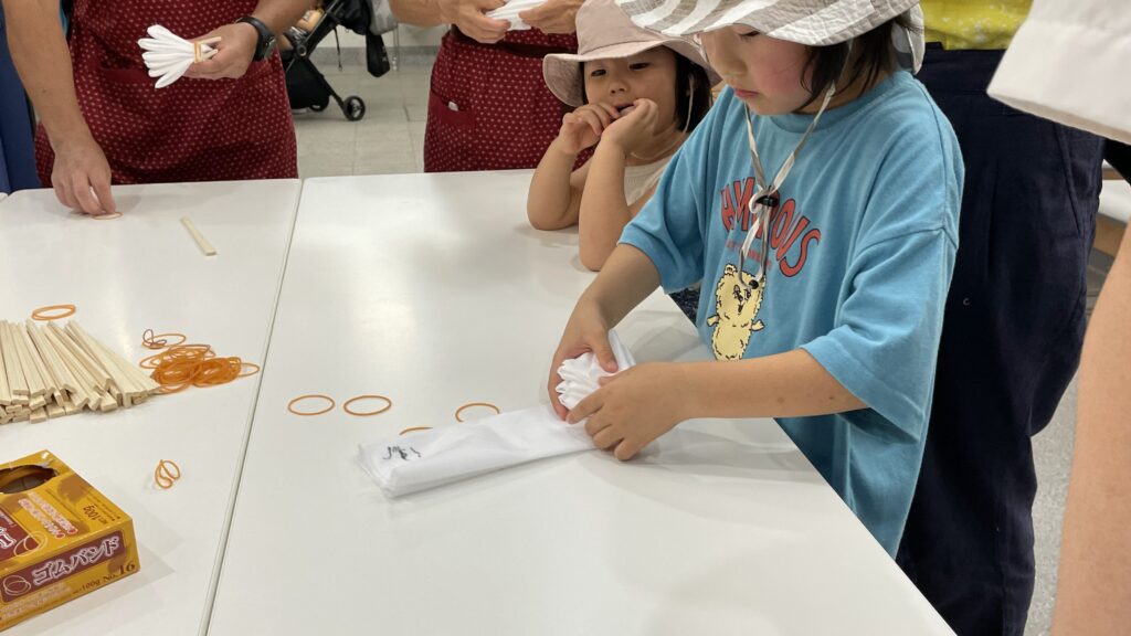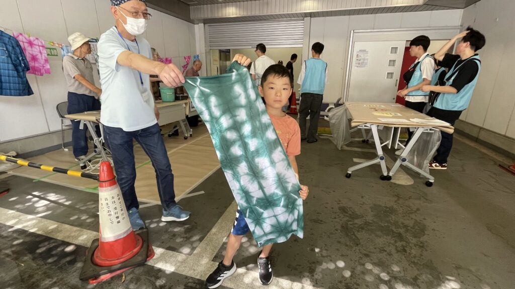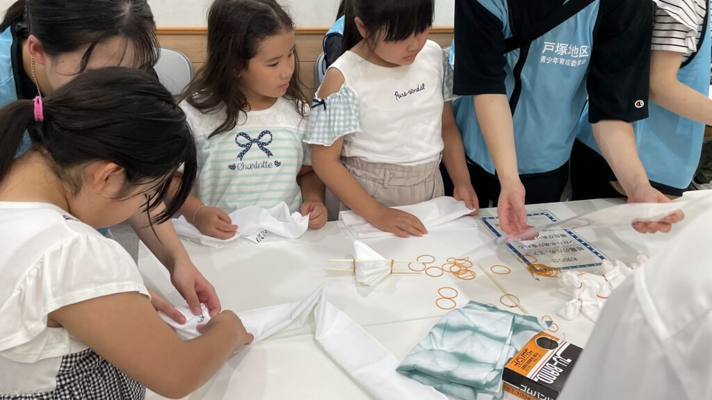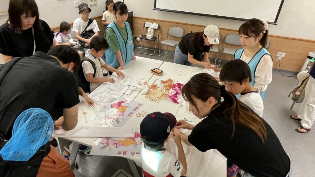 好天にも恵まれ、多くの子どもたちが絞り染めの体験を楽しみました。参加者は白い布を自分の好きな工夫で染め上げ、出来上がった作品を嬉しそうに持ち帰りました。